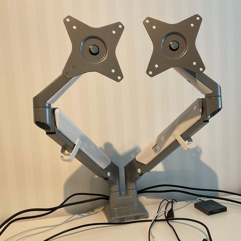 Universell skärmstativ för skrivbord med justerbar arm och klämfäste. Passar för att montera skärmar på skrivbord och ger flexibilitet i höjd och vinkel.
