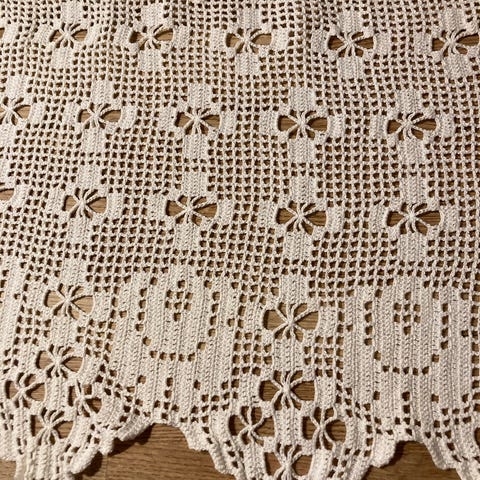 Vitt tyg i bomull i okänt märke. Material och storlek är inte angivna. Tyget har hålsö och bred spets på ca 8 cm har en enkel design och är lämplig för vardagligt bruk. Ca 140cm lång och ca 40 cm bredd
