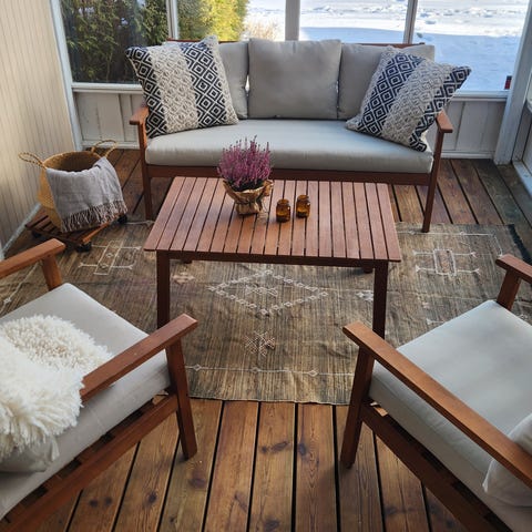 Kuddarna har förvarats inomhus och är i mycket fint skick! Soffan är även den i fint skick men kan behöva torkas av med en trasa bara.