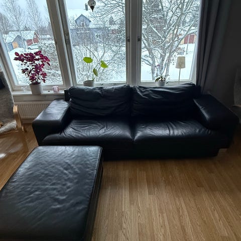 Skinnsoffa och fåtöljer.