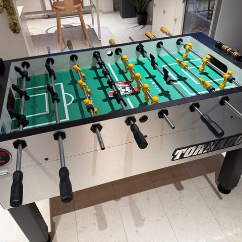 Bordfotbollspel med vit ram och grönt spelplan