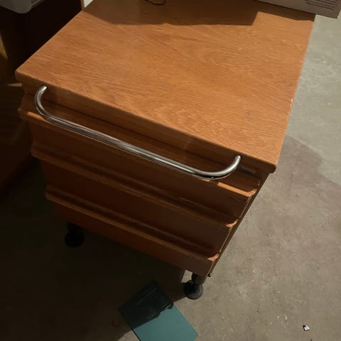 Rullhurts i trä, med kromdetaljer. Tre lådor.