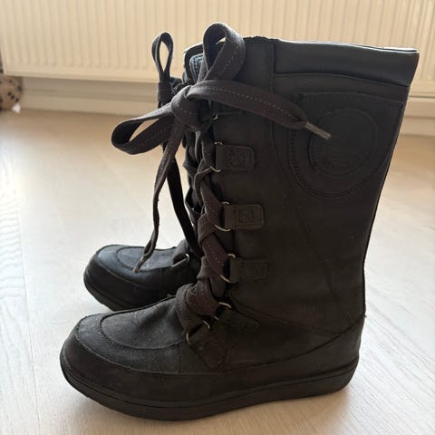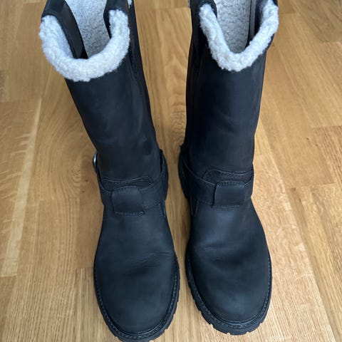 De är varmfodrade, tillverkade i äkta läder och har stabil snörning som ger bra stöd runt benet – perfekta för kalla vinterdagar.