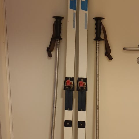 Första längdskidorna? 100 cm långa med bindning/remmar för vinterskor. Stavar 80 cm ingår.