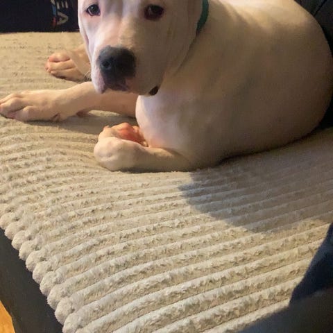 Hon är fantastiskt snäll, försiktig med barnen och funkar utmärkt just nu som kontorshund. Ligger lungt och sover genom arbetsdagen och är nöjd med schema lagda raster.