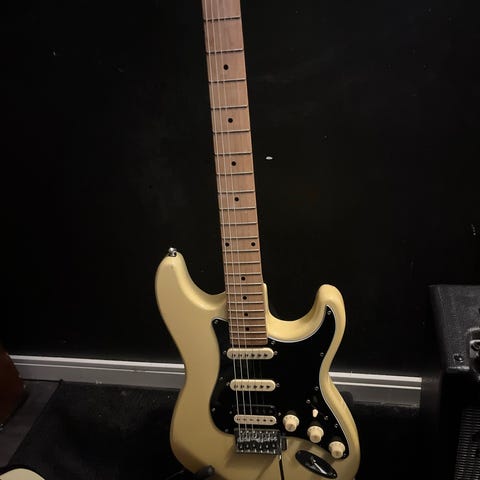 Snygg ihopsatt strata i candy Apple red. Delarna är från en squier affinity gitarr. Halsen inoljad och vaxad för bättre känsla. Nytt pärlemor plektrum, ser ju snyggt ut. Mickarna är kopplade genom en femlägetswitch: stall/stall- mitt/mitt/mitt-hals/hals. Kopplad så att en volym och en ton styr alla tre mickarna(nedersta potten är ej inkopplad men finns att tillgå för den som vill löda om det hela till en traditionell stratakoppling.