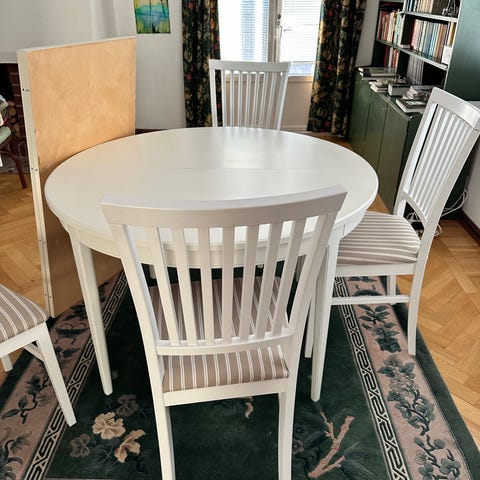 Stabilt matbord som kan bli riktigt stort med iläggskivorna monterade. Finns lite nötmärken och skador därav det låga priset.