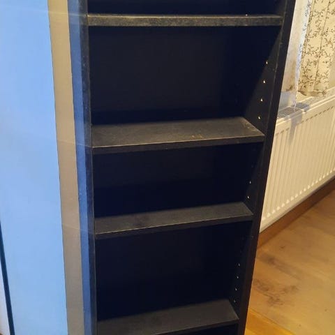 Bokhylla i trä, inte spånskiva, med brunt faner, svensktillverkad, sex sektioner, finns ytterligare en överliggare till hela bokhyllan om man inte vill använda vitrinskåpet utan ha en större tv i stället. Belysning finns både till vitrinskåp och till överhylla. Förvarvaras just nu i uppvärmt magasin pga platsbrist. Mycket fint skick, sent 60-tal. Hämtas i Kalmar. Tag med bärhjälp.