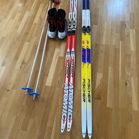Fischer längdskidor med tillhörande stavar och pjäxor. Skidorna är avsedda för längdskidåkning och levereras tillsammans med stavar och pjäxor för komplett utrustning.