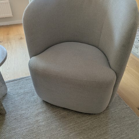 Fåtölj med randigt tyg i blått och vitt. Klädseln är av tyg och fåtöljen har en rundad form med mjuka armstöd. Passar för vardagsrum eller läshörna. Klädseln är avtagbar och kan tvättas.