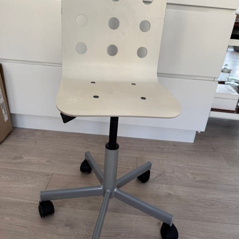 IKEA Örfjäll barnstol med svart sittdyna och ryggstöd, vit metallram och hjulbas. Passar för barn och kan användas vid skrivbord eller arbetsyta. Höj och sänkbar.