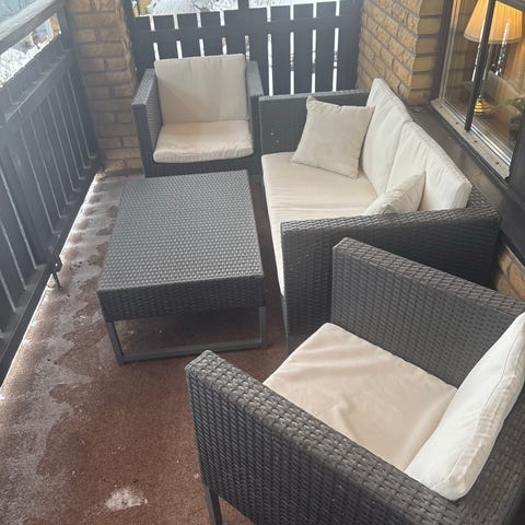 2 st snurrfåtöljer i rotting med tillhörande soffbord. Med gungfunktion. Dynor ingår men behöver att fräschas upp. Lite slitage på ett armstöd på varje fåtölj, vänligen se bilderna. Sitthöjd 45 cm, totalhöjd 102 cm, bredd på sittdynan 55 cm, totalbredd med armstöd 84 cm, totaldjup 92 cm. 1000 sek för båda + soffbord.