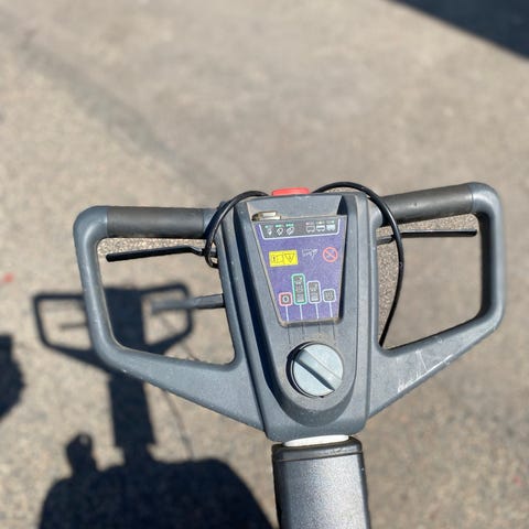 Nilfisk SC351 städmaskin för rengöring av golv. Utrustad med roterande borste och hjul för enkel förflyttning.