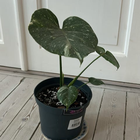 Monstera växt med stora gröna blad, lämplig för inomhusbruk. Växten har karakteristiska hål och skåror i bladen, vilket är typiskt för arten. Ytterkruka ingår inte