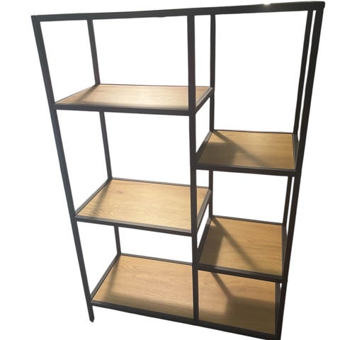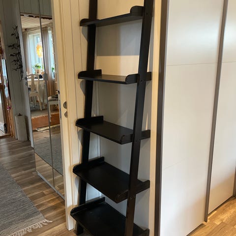 Säljer en hylla av metall, färgen är svart och mått är D 34cm, H 150cm, B 35.