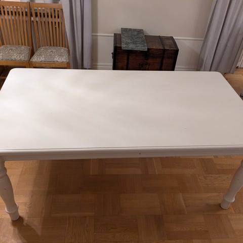 Robust matbord. Skivan är slipbar. Inklusive 4 stolar i furu