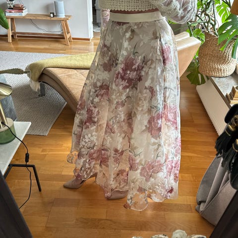 Kjol använd vid bröllop i stadshuset. Jättevacker i creme-färg. Storlek 36. Hel o ren o förvarats i garderob.
