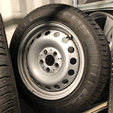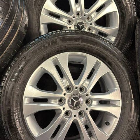 Vi erbjuder en komplett uppsättning original Mercedes-Benz plåtfälgar(16tum), utrustade med premium sommardäck av märke CONTINENTAL CONTIVANCONTACT 200.