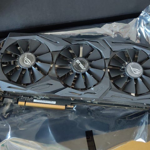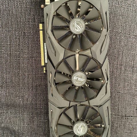 Asus ROG Strix grafikkort med tre fläktar och flera anslutningsmöjligheter inklusive DVI, HDMI och DisplayPort. Grafikkortet har en robust kylning och är designat för hög prestanda i datorer.