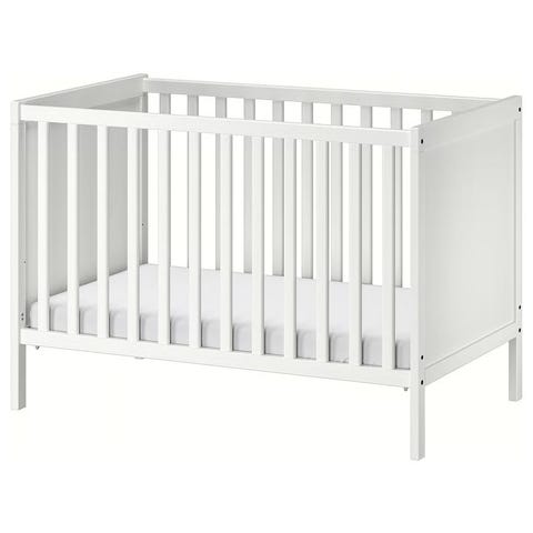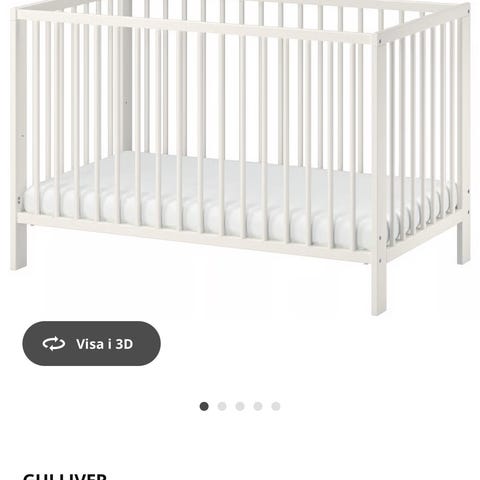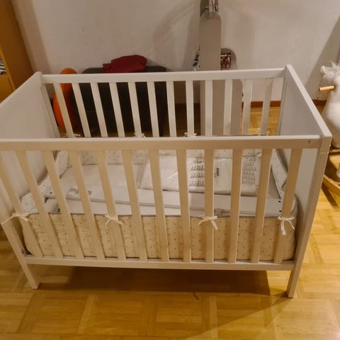 Spjälsäng i vitt trä med inbyggd elefantdekor på huvudgaveln. Passar för små barn och har en enkel, klassisk design. Sängen har spjälor runtom för säkerhet och en fast bottenplatta. Madrass ingår ej.