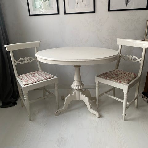 Runt bord 1950-tal med 2 iläggsskivor,bord 120cm i diameter +2x 60 cm skivor och 2 stolar i en modell + 3 stolar i annan modell.Bra skick, bordet behöver teakoljas. Samma klädsel på alla stolar i ok skick. Finns att hämta i Lövstalöt, betala med swich.