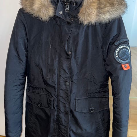 Svea Vinterjacka i mörkblå färg, storlek M för dam. Jackan är avsedd för vinterbruk och har en huva med pälsliknande kant.