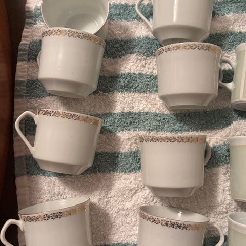 Äldre koppar och fat i varierande mönster och färger. Delarna inkluderar koppar med fat i vitt, rosa och blommönster samt detaljer i guld. Servisen är lämplig för servering av kaffe eller te.
