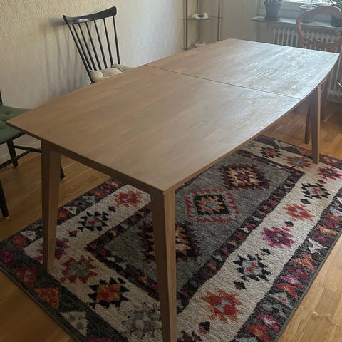 Diameter 115cm, höjd 75cm. Iläggskiva 42cm. Nyinoljat, inga skador.