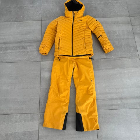 Skidset (köpt var för sig men använt ihop) i fint skick. Jackan i strl 170, är i nyskick och med många bra skiddetaljer. Byxorna i strl 160 är i bra skick, bortsett från slitningar nedtill, såsom det blir vid den förstärkta delen efter skidor/pjäxor.
