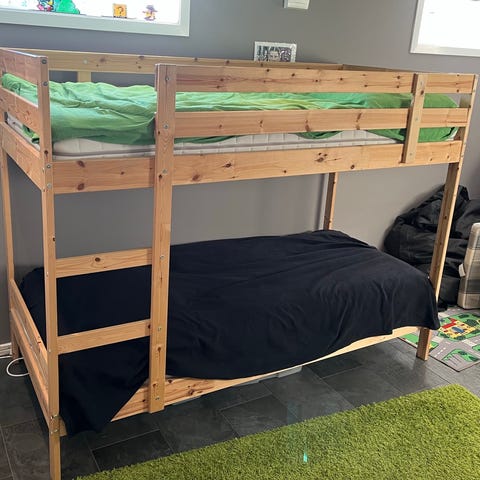 Obs: En sidoplanka saknas. Sängen är ändå fullt funktionell då den står mot vägg, vilket vi haft utan problem.
