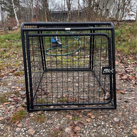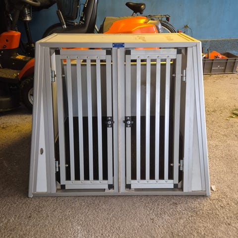 En Robust dubbelbur. Ett defekt gångjärn på Vä dörren. Går ej att öppna men fullt användbar. D:100cm H:66cm B:102cm
