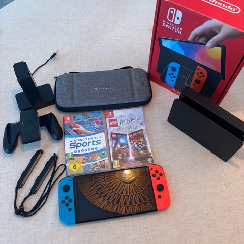 Inköpt februari 2024 och aldrig kommit till användning riktigt utan samlat mer damm än nöje! Nintendo Switch Oled spelkonsol med Joy-Con-kontroller i blå och röd färg. Inkluderar spelkassetten Mario Kart 8 Deluxe samt Bluey the videogame och tillbehör såsom laddare, dockningsstation och handkontroll. Konsolen är bärbar och kan användas både som stationär och mobil spelplattform.
