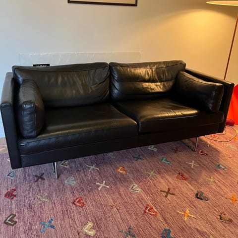 Säljer en Pantonova Linear designad av Verner Panton i krom. Två dynor ingår, svart läder och ljusblått sammetstyg. Tillverkad av danska varumärket Montana Furniture, köptes 2019.