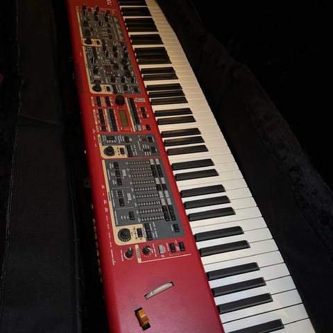 Piano, orgel och synth i ett, 88 anslagskänsliga tangenter. Stativ, notställ, pedal och mjukt case med hjul ingår.