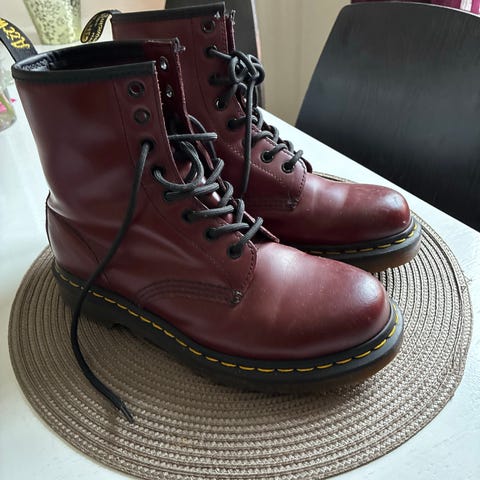 Coola Dr. Martens stövlar i storlek 36, vinröd färg. Skorna är tillverkade av läder och har snörning fram. Passar för användning som vardags- eller friluftsboots. Har använts av dottern. Lite skav finns längst fram på skon.
