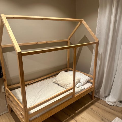 Sängen har avtagbara sidoskydd, och inkluderar en förvaringslåda samt madrass.