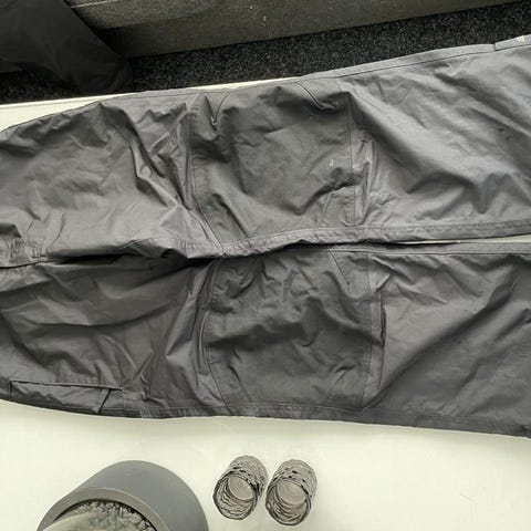 Sparsamt använda, svart, överdragsbyxor i stl 150.