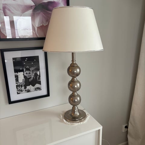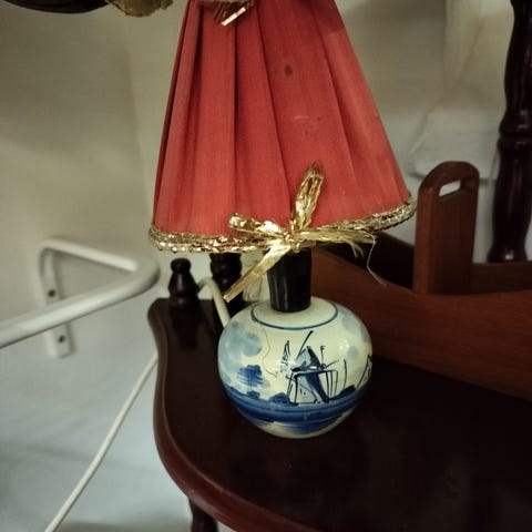 Lampfot med 2 lampskärmar röd och grön (åt limehållet).