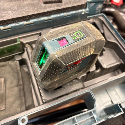 Bosch Professional GLL 3-80 C laserinstrument med funktioner för horisontella och vertikala laserlinjer. Inkluderar batteriladdare och förvaringsväska. Används för precisionsmätningar och uppriktning i bygg- och snickeriarbeten.