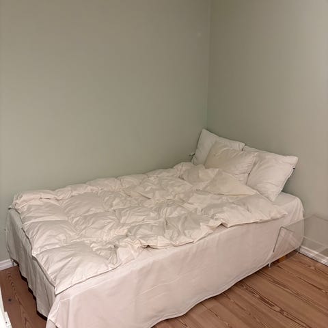 Hej! Måste tyvärr göra mig av med min säng då den är lite liten för två. Alla delar är i fint skick och jag tycker den är superskön. Hyfsat fast, inte hård.