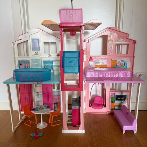Barbie dockhus i plast med flera rum och färgglada detaljer i rosa, lila, blått och vitt. Passar för barn och kan användas för lek och inredning av dockor. Modellen heter Malibu.