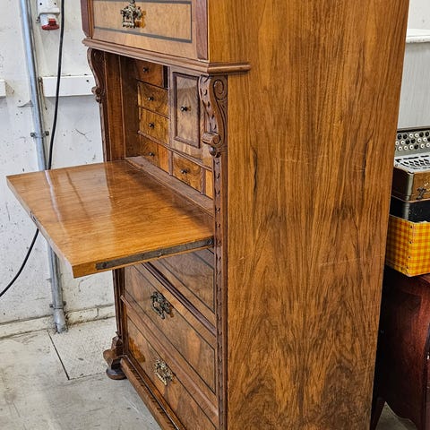 Träslaget är okänt, men sannolikt valnöt eller annat ädelt lövträ – ådringen och patinan talar sitt tydliga språk. Det här är ett genuint hantverk med fina proportioner, genomtänkta detaljer och en kvalitet som är svår att ens uttala i dagens möbelvaruhus.