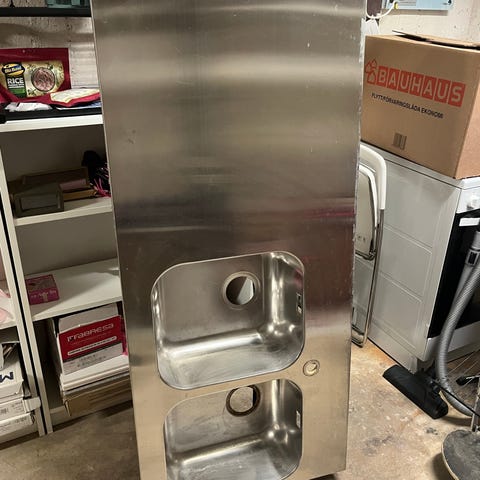 Vändbar diskbänk med 2 stora lådor för nedfällning. Säljs komplett med korgventiler, bräddavlopp, ett kranhål och vattenlås. Underskåp 800mm