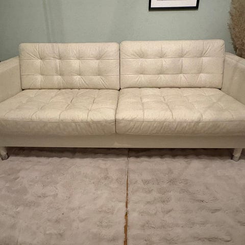 Sofforna är medelstora och på den mindre soffan så är den högra armstöden lite sönder alltså att den gungar lite om man pressar den för hårt. Den större soffan är perfekt och fåtöljen har inte heller något problem! Originala priset 6000kr och rabatt priset är 2000kr Priset kan diskuteras.