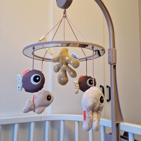 Musikalisk mobil för spjälsäng i gott skick. Har en spricka i based men detta påverkar inte funktionen. Kan fästad på spjälsängen och spelar lugn musik.