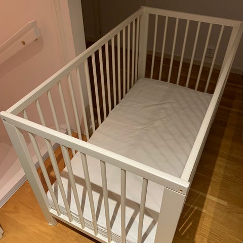 Spjälsängsskydd och madrass kan köpas till för en billig peng. (Se bild)