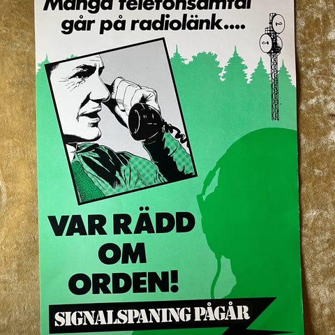 Affisch med texten 'Hög hemliga uppgifter Telekonferenser i statsförvaltningen Obehörig kan lyssna'. Affischen är tryckt i flera färger inklusive rött och grönt på en beige bakgrund. Den visar en grafisk illustration med telefoner och en siluett av ett huvud.