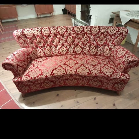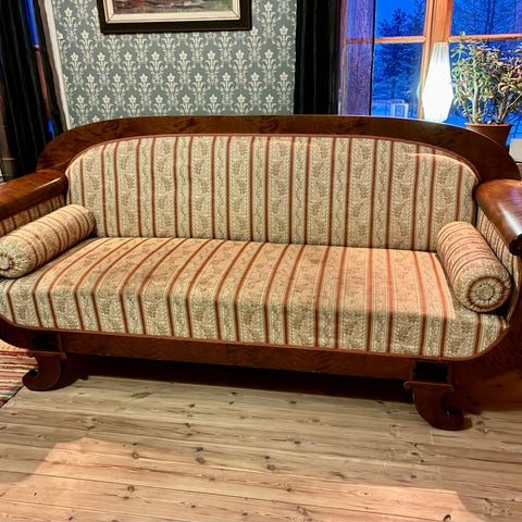 Antik soffa med träram och randigt tygklädsel i färgerna rött och beige. Soffan har en klassisk form med en svängd rygg och armstöd. Passar för användning i vardagsrum eller som en dekorativ möbel i andra rum.