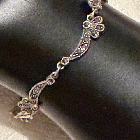 Ett vackert armband i äkta silver med infattade blåa safirer. Armbandet har en detaljerad design och ett säkert spänne. Perfekt för den som älskar klassiska smycken. Längd 19 cm bredd 1cm (bredaste delen). Perfekt som en present