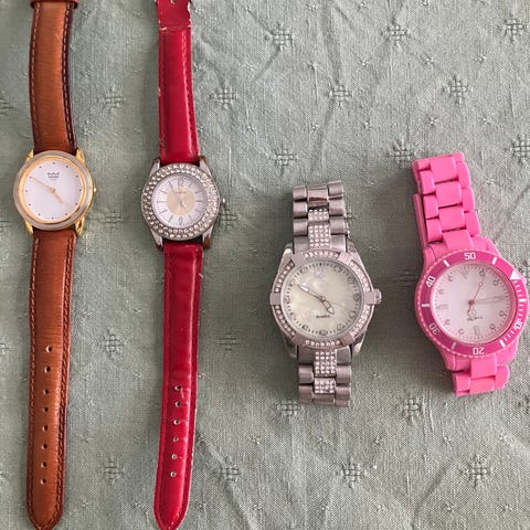 Guldfärgad klocka på läderarmband.
